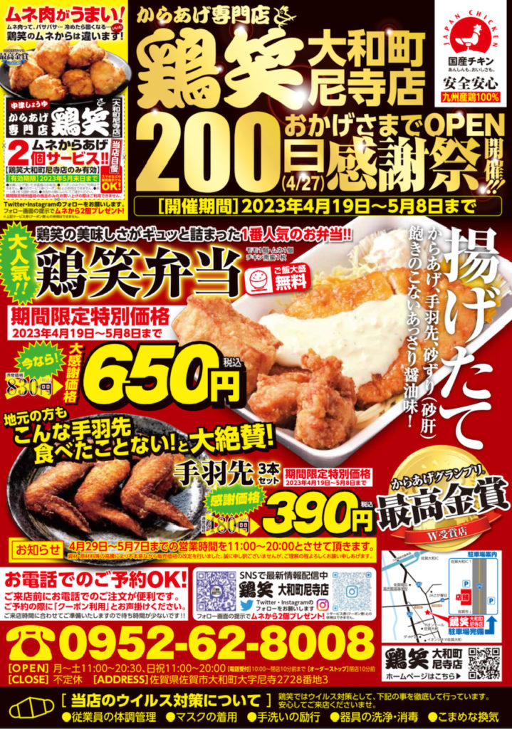 鶏笑 大和町尼寺店は4/27(木)でおかげさまでオープン200日を迎えます!